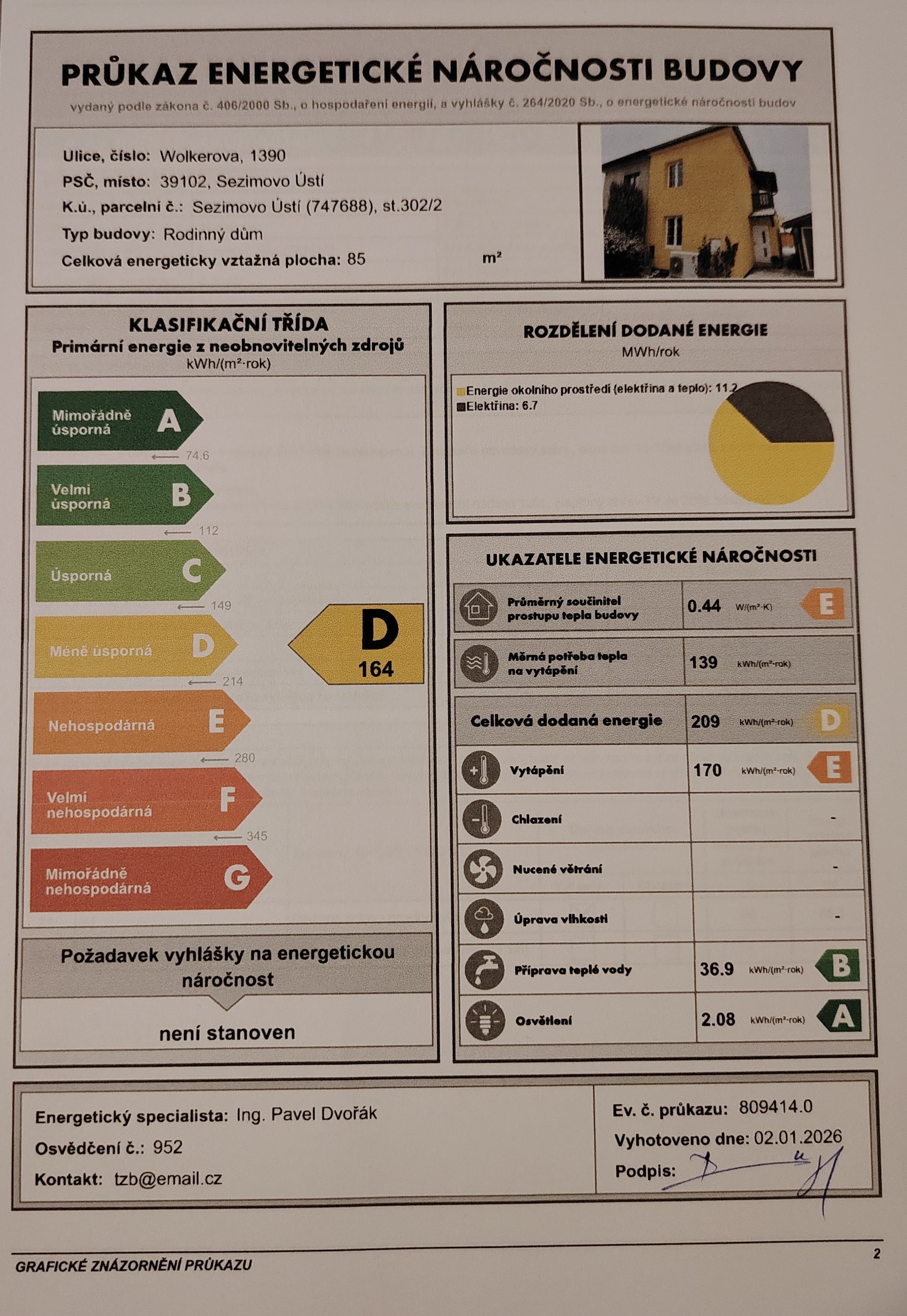 Energetická náročnost budovy: třída D (méně úsporná), ukazatel 164 kWh/m²/rok.